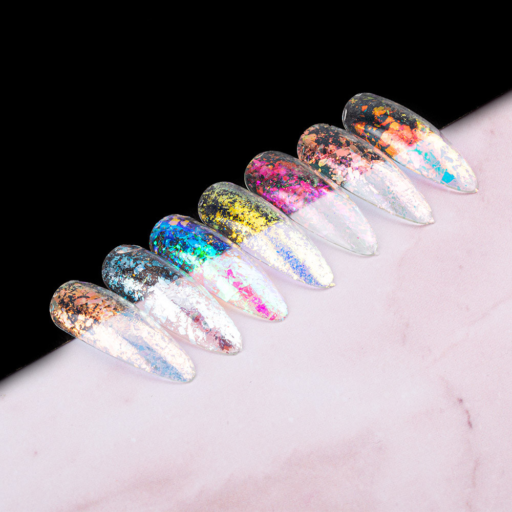 Fiocchi decorativi semitrasparenti e iridescenti in diversi colori unici! L’unico, unico effetto che possiamo utilizzare in tanti modi. L’effetto può essere utilizzato con qualsiasi metodo di styling delle unghie, compresi gli smalti tradizionali!
