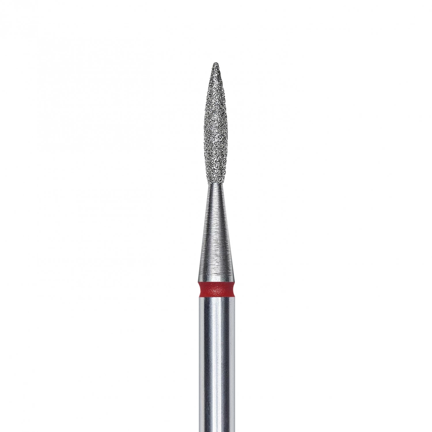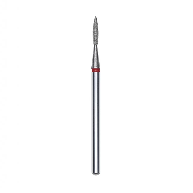 Punta diamantata Fiamma Appuntita – Grana fine rosso – Diametro 1.6 mm – Lunghezza punta 8 mm – Viene utilizzato per la lavorazione di pieghe ungueali laterali, crepe e calli – Acciaio inossidabile